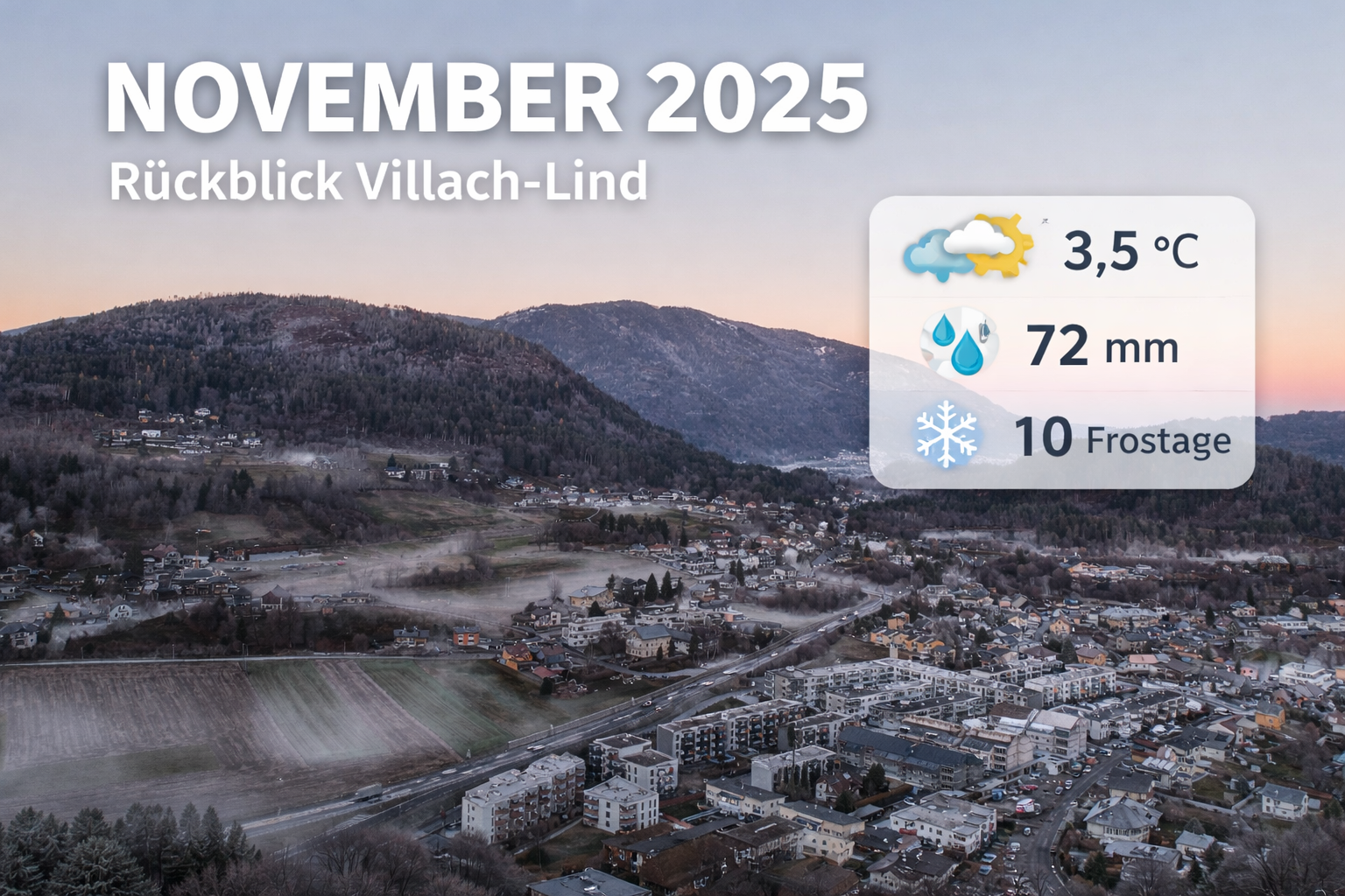 Der November 2025 präsentierte sich in Villach-Lind als typischer Spätherbstmonat mit zunehmenden winterlichen Akzenten, jedoch ohne nachhaltigen Wintereinbruch. Mit einer durchschnittlichen Temperatur von 3,5 °C lag der Monat nahe am Klimamittel von 3,6 °C (1991–2021). Auffällig war jedoch die ausgeprägte zweite Monatshälfte, in der sich mehrere Frostphasen einstellten.