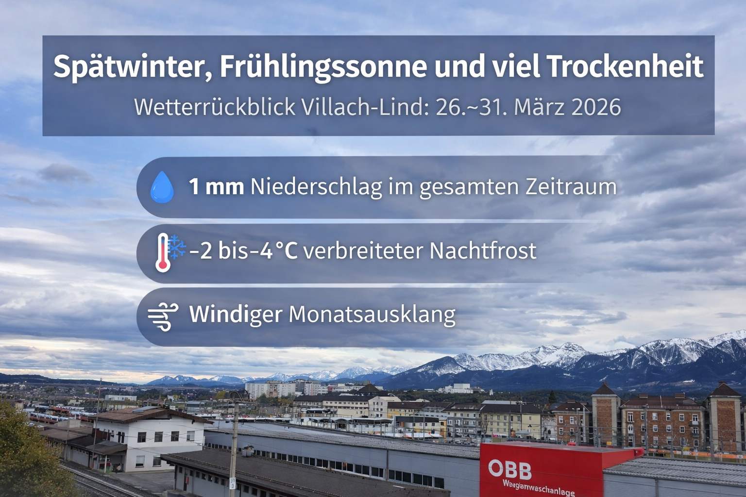 Die letzten Tage des März 2026 zeigten sich in Villach-Lind als markanter Übergang vom spätwinterlichen Einfluss hin zu trocken-kühlem Frühlingswetter. Dabei dominierten vor allem zwei Faktoren: kaum Niederschlag und häufige Frostnächte.
