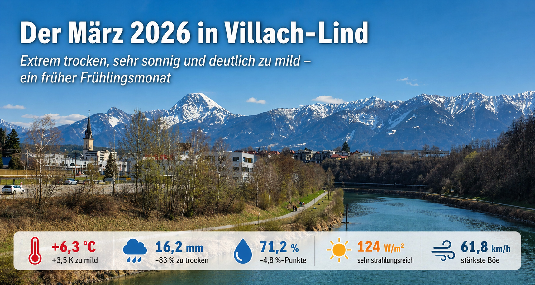 Der März 2026 präsentierte sich in Villach-Lind als außergewöhnlich trockener und deutlich zu milder erster Frühlingsmonat, der bereits frühzeitig frühlingshafte Verhältnisse brachte. Während typische Märzwetterlagen mit wechselhaftem Charakter weitgehend ausblieben, dominierte über weite Strecken stabiles Hochdruckwetter.