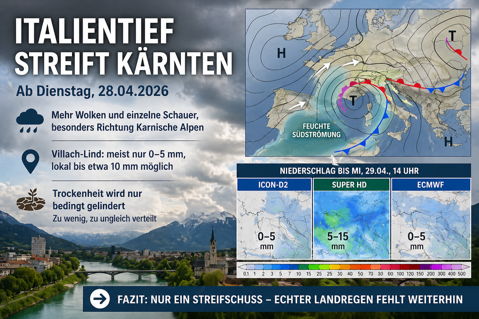Nach mehreren nahezu perfekten Frühlingstagen mit frühsommerlichen Temperaturen deutet sich ab Dienstag, 28.04.2026 eine Umstellung der Wetterlage an. Aus Süden greift ein Italientief auf den Alpenraum über und bringt zunehmend feuchtere Luft in den Süden Österreichs.